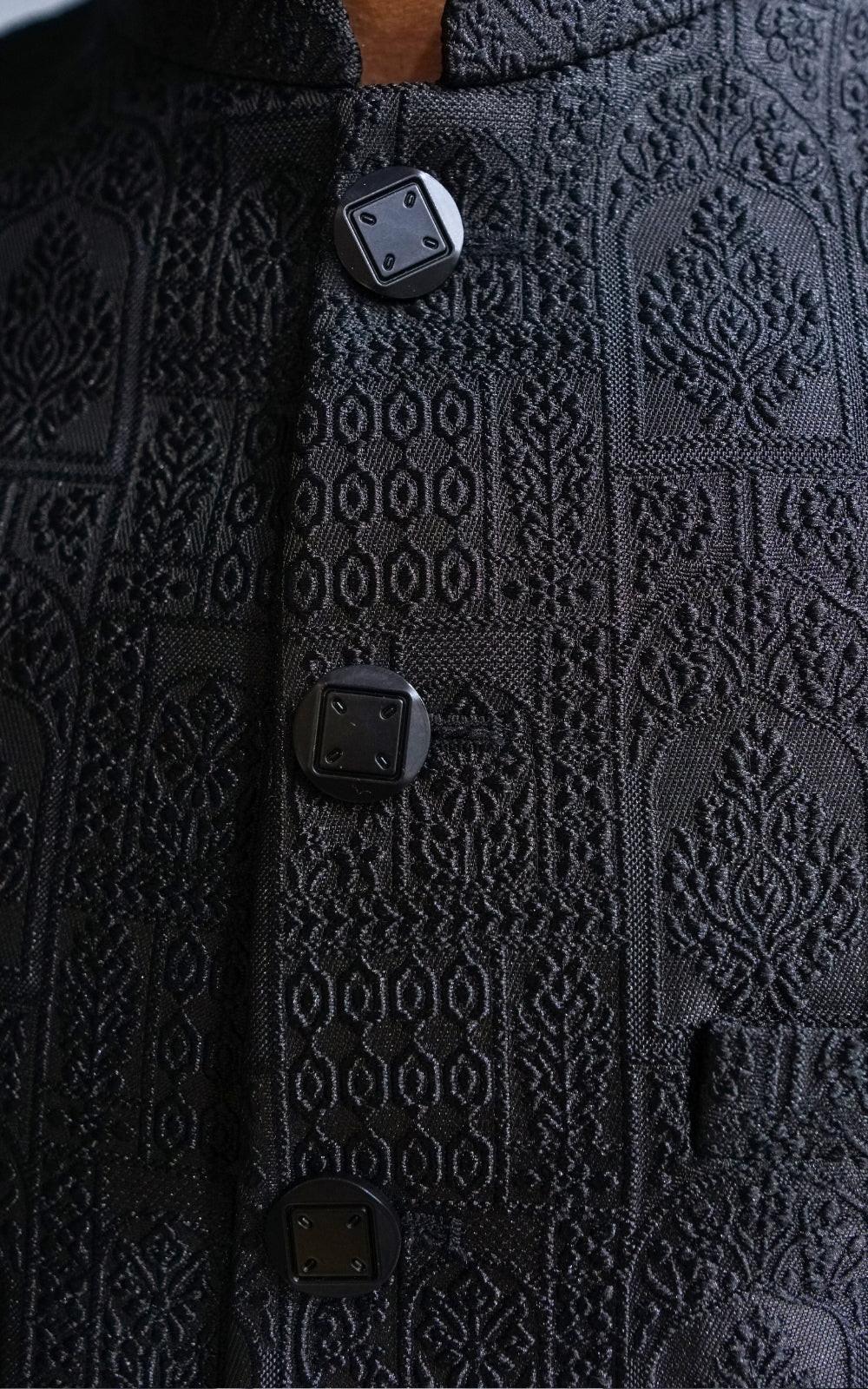 Step into refined sophistication with this Black Self Embossed Jamawar, crafted for a graceful and confident look. The rich black shade enhances the luxurious texture of the fabric, while the intricate embossed detailing adds a touch of traditional charm. Perfect for weddings, festive events, or formal evenings, this piece delivers timeless elegance with a modern edge and a flawless, tailored finish.