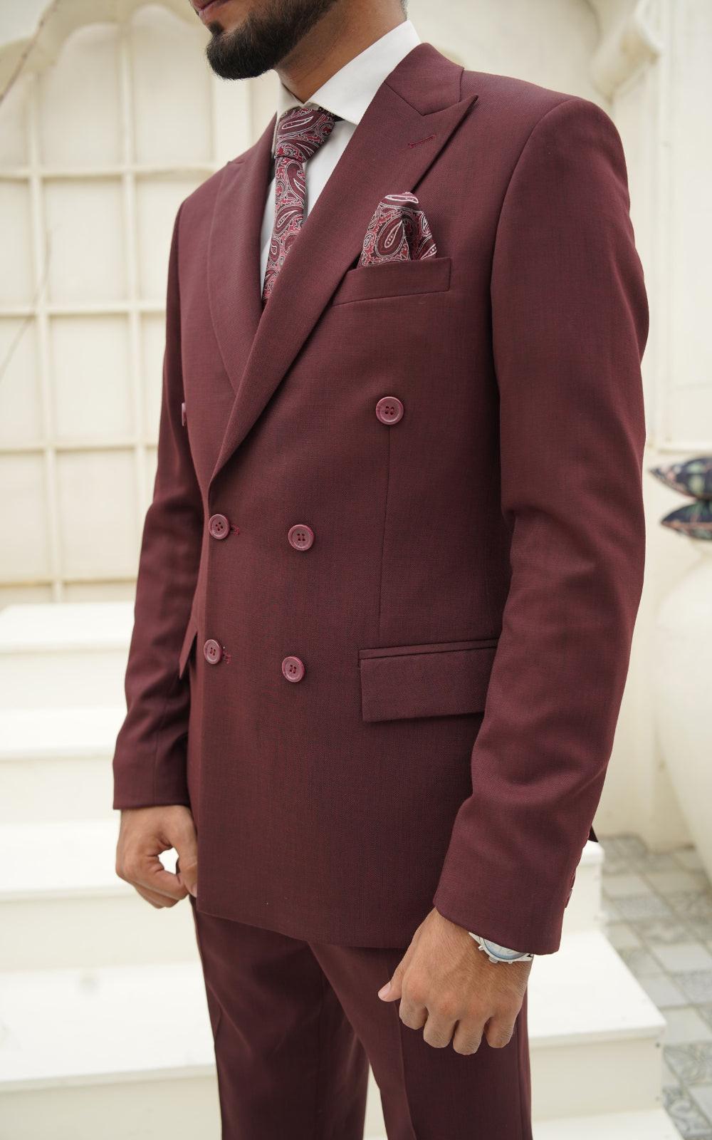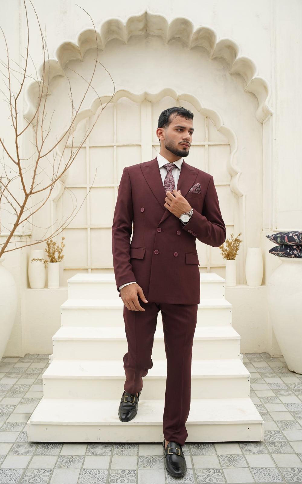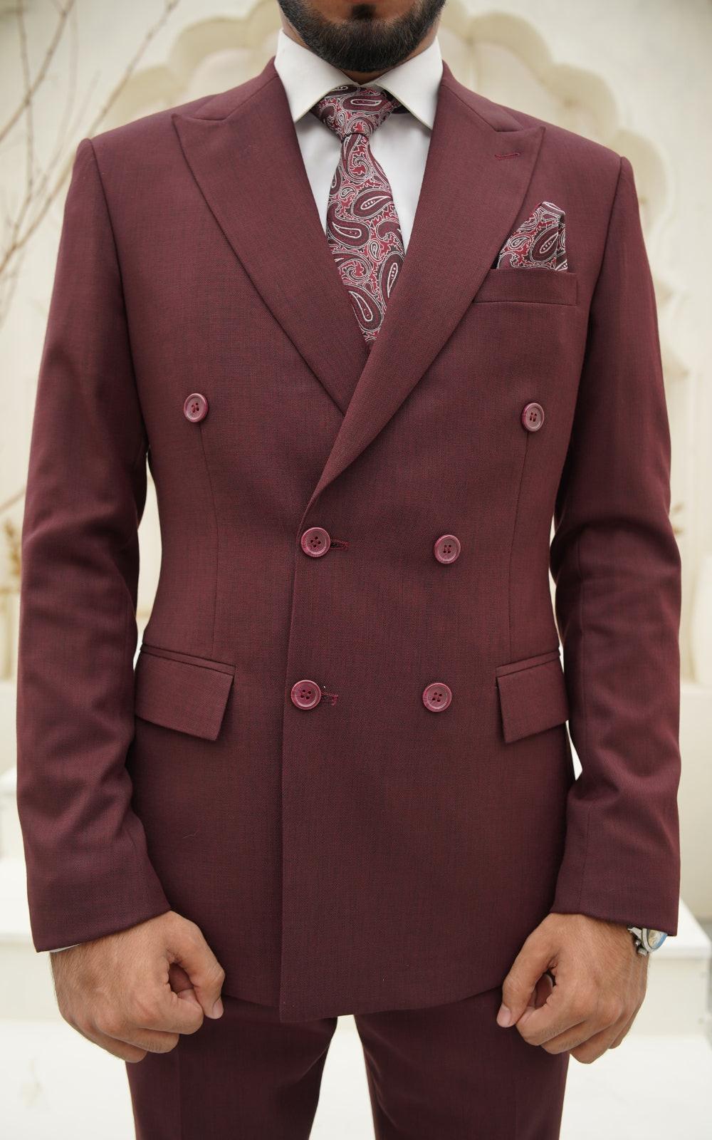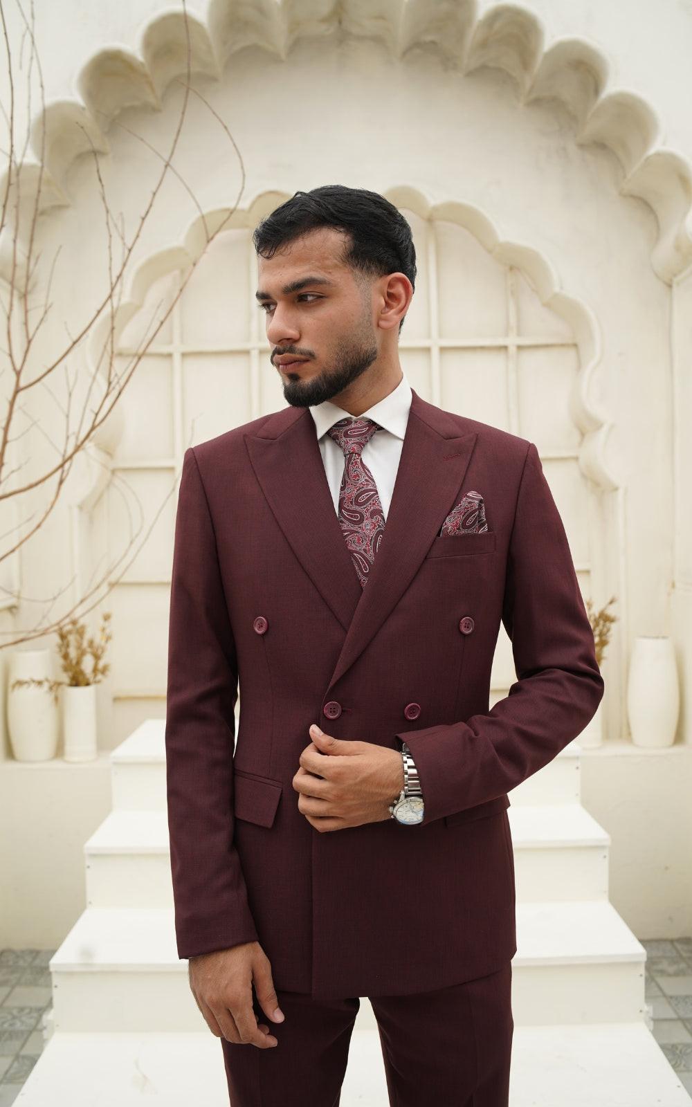 Crafted in a rich Burgundy Maroon shade, this Double Breasted Suit exudes sophistication and class. Made from premium tropical suiting fabric, it offers a smooth, refined texture with an impeccable tailored fit. The deep hue adds a bold yet elegant charm, making it ideal for weddings, receptions, and formal gatherings. Designed to command attention with effortless grace, this suit is a true expression of modern luxury and timeless style.