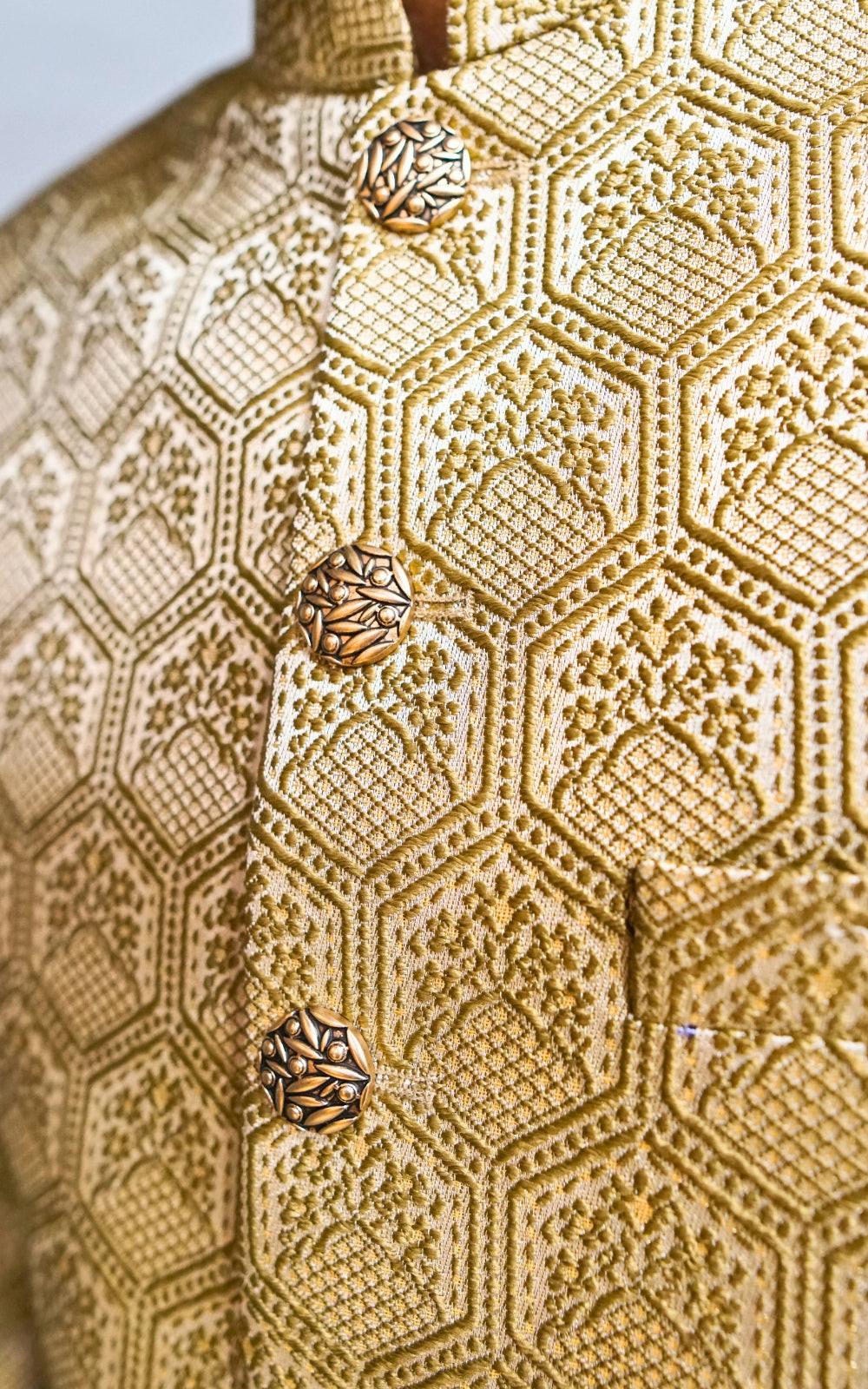 A graceful statement piece crafted from premium self-embossed Jamawar fabric in a soft ivory beige tone. Its intricate woven texture exudes traditional charm with a refined, modern finish. Designed for weddings or formal gatherings, this waistcoat delivers effortless sophistication and comfort. Tailored to perfection with a flawless fit that enhances every attire, it’s a timeless addition to your festive wardrobe.