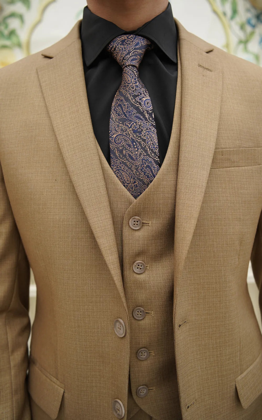 This three piece suit comes in a warm sand brown shade that gives a clean, elegant look. The slim fit cut keeps the shape modern and balanced without feeling tight. The coat, waistcoat, and trousers are designed to sit smoothly on the body and hold their structure throughout the day. This color works well for daytime events, weddings, office functions, and casual formal gatherings. Pair it with a white or cream shirt to highlight the soft tone and create a fresh, polished style.