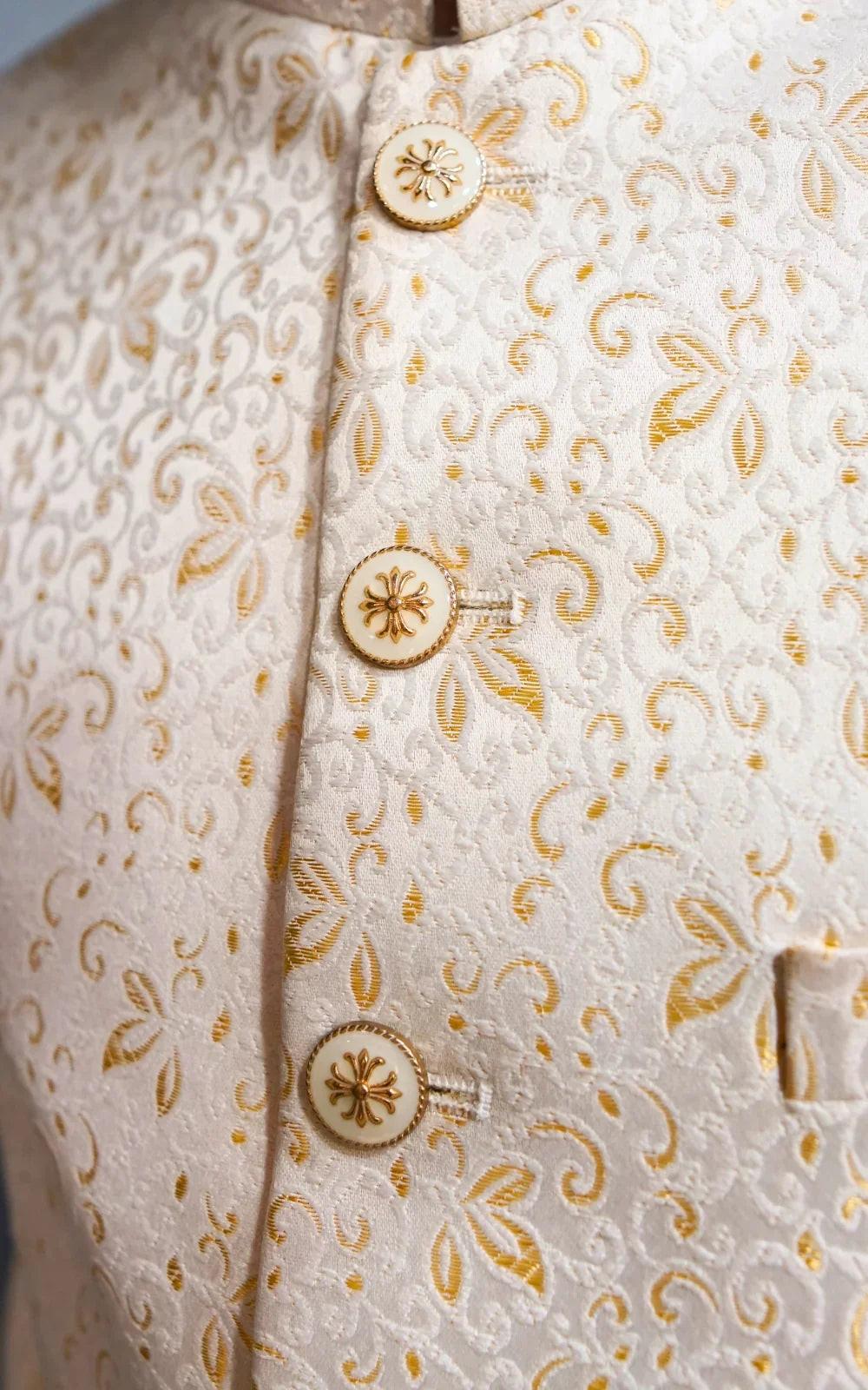 Crafted in an elegant Off White shade (#F5EBDD), this Self Embossed Jamawar Prince Coat defines sophistication with its intricate woven texture and timeless royal appeal. The subtle floral embossing adds depth and luxury, while the structured tailoring ensures a refined silhouette. Perfect for weddings and festive occasions, this coat combines tradition with contemporary grace, creating a polished and graceful statement look.