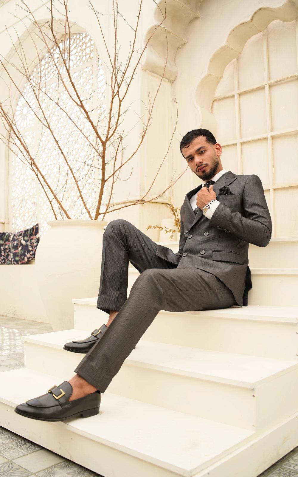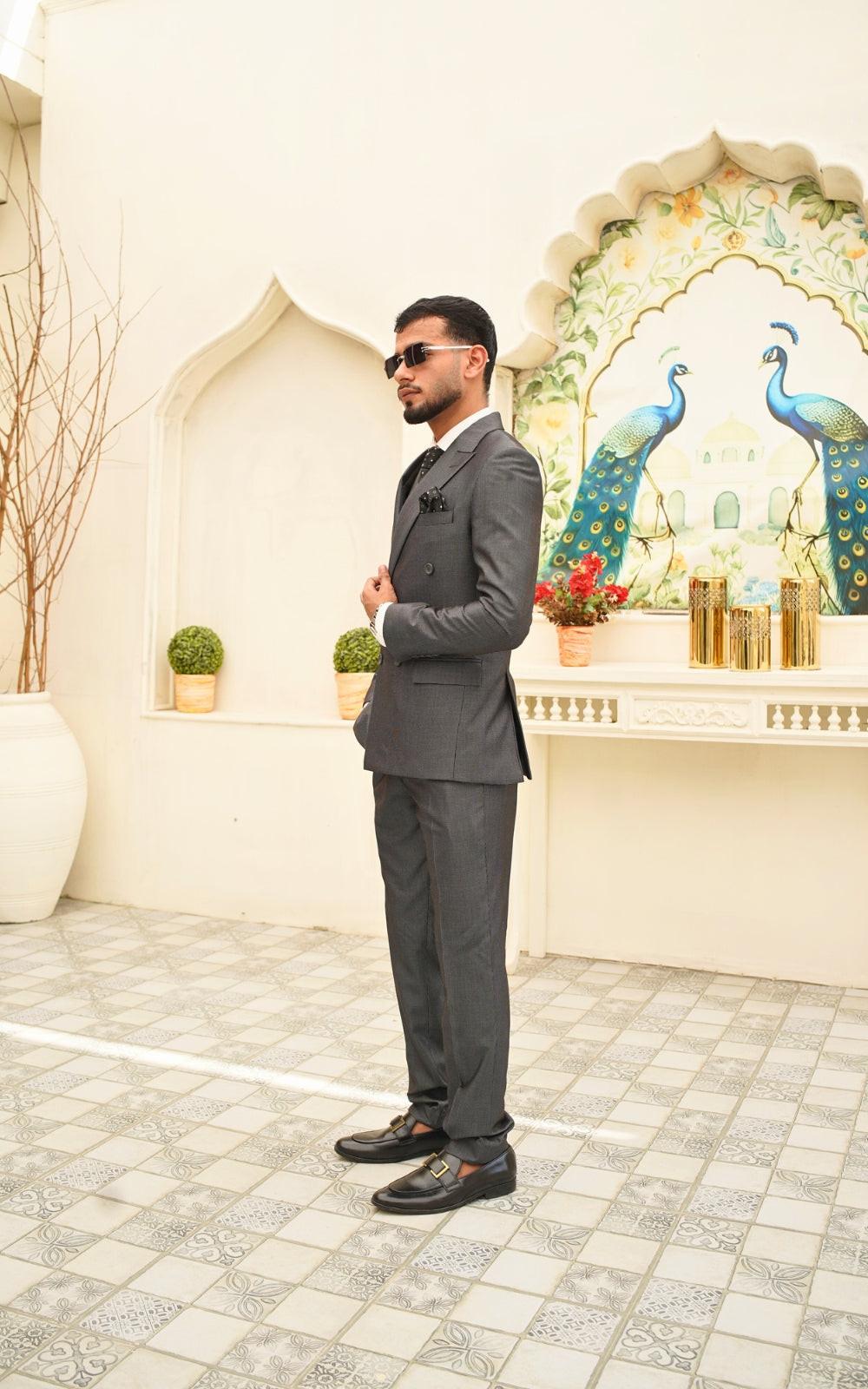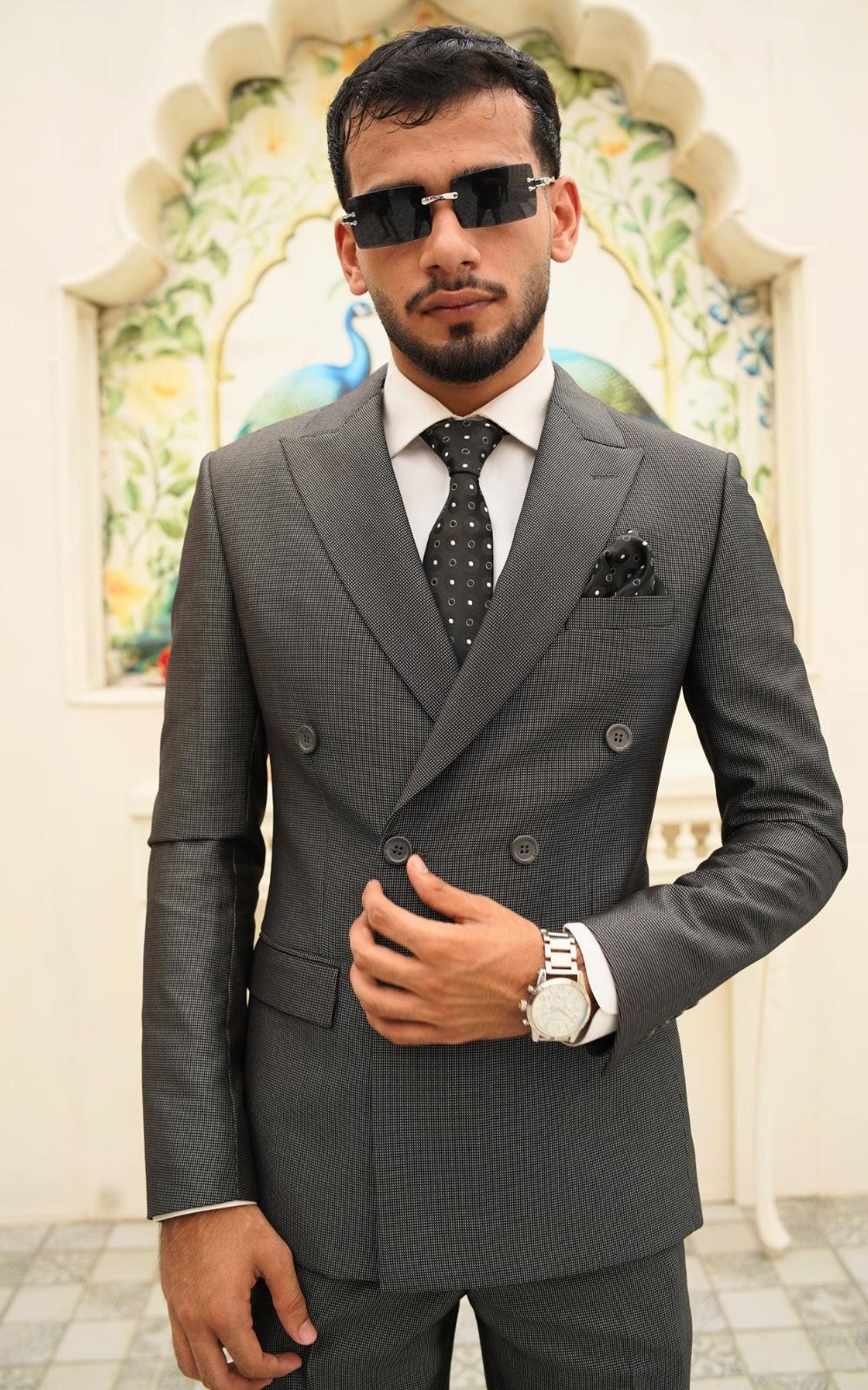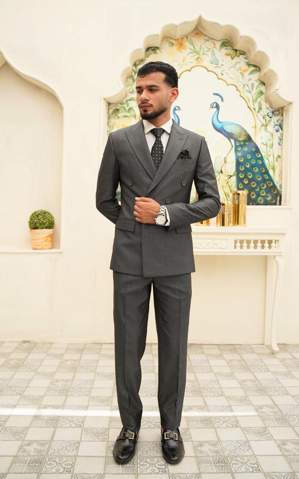 Refined and timeless, this Textured Grey Double Breasted Suit is tailored from high-quality tropical suiting fabric that offers a sleek, structured drape. The subtle texture enhances its elegance, while the double-breasted design gives it a commanding, modern edge. Perfect for formal occasions or grand celebrations, this suit delivers a statement of sophistication and confidence with every detail crafted to perfection.