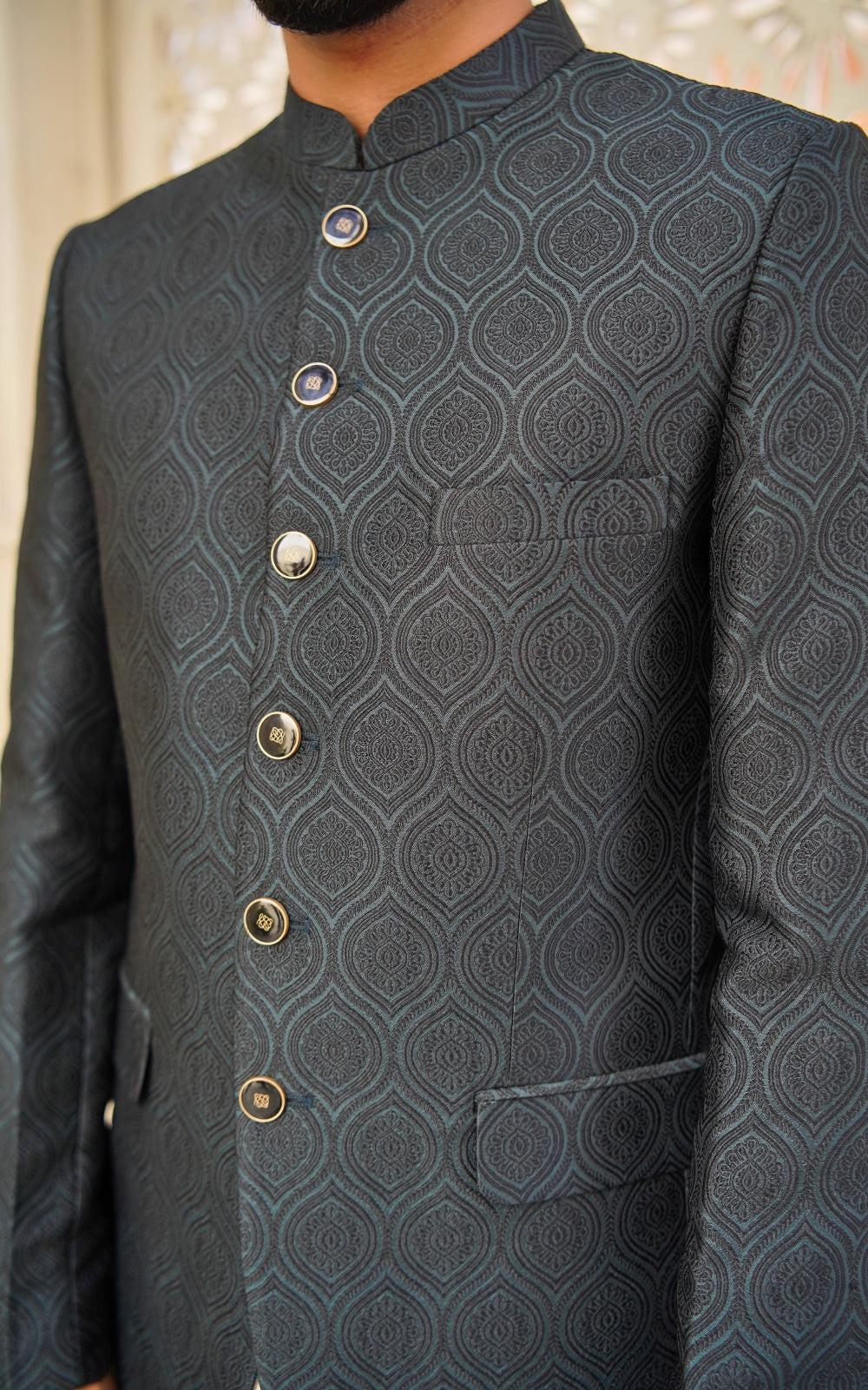 Elevate your traditional look with this dark green self-embossed Jamawar Coat, crafted with refined detailing and a rich texture that exudes grace. Its elegant pattern and perfect tailoring make it ideal for festive gatherings or formal occasions. Designed to add a regal touch to your outfit, this piece blends timeless charm with modern sophistication — a statement of class and confidence.